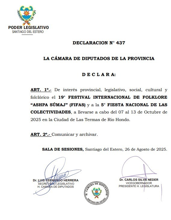 DECLARACIÓN DE INTERÉS PROVINCIAL, LEGISLATIVO, SOCIAL, CULTURAL y FOLKLÓRICO el 19° Festival Internacional De Folclore “Ashpa Súmaj” y 5ta. Fiesta Nacional de las Colectividades por la Cámara De Diputados SDE.